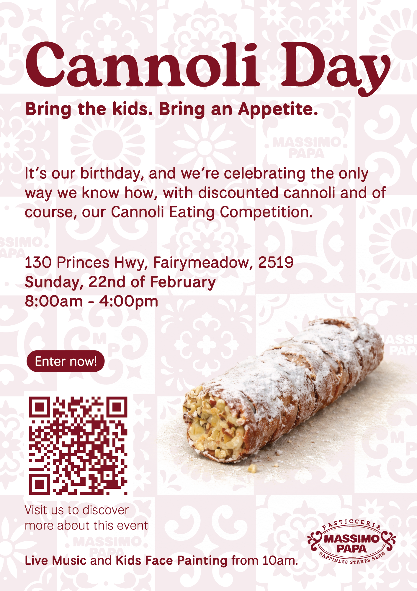 🎉 Get ready to indulge in sweetness and fun at our annual Cannoli Day! 🍬 Save the date: Sunday, February 25th – the last Sunday of February! 🗓️ Bring the whole family for kids face painting, groove to live music, and brace yourselves for the ultimate Cannoli Eating Competition! 🏆🍩 Who will be crowned the next Cannoli Champion? 🤔 Mark your calendars and join us for a day of laughter, music, and the irresistible taste of Cannoli perfection! 🎶🍰 #CannoliDay #SweetTradition #FamilyFun #cannoli #massimopapa #illawarrasbestcakes #familyfunday #fundayout #eat #mangia #holycannoli #getkeen #getexcited #itscoming #notlong #startpracticing